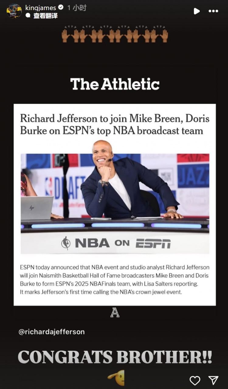 杰弗森加入ABC/ESPN转播队伍 !詹姆斯:恭喜我的兄弟