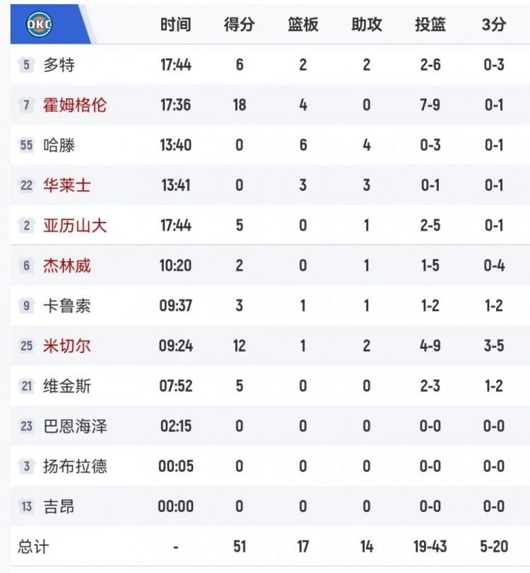 雷霆上半场全队整体三分线表现不佳,全队三分20投5中,命中率仅25%。先发五虎三分7投全铁,英超直播在线高清(无插件)其中多特三分3中0,后备 席上杰林威三分4中0。