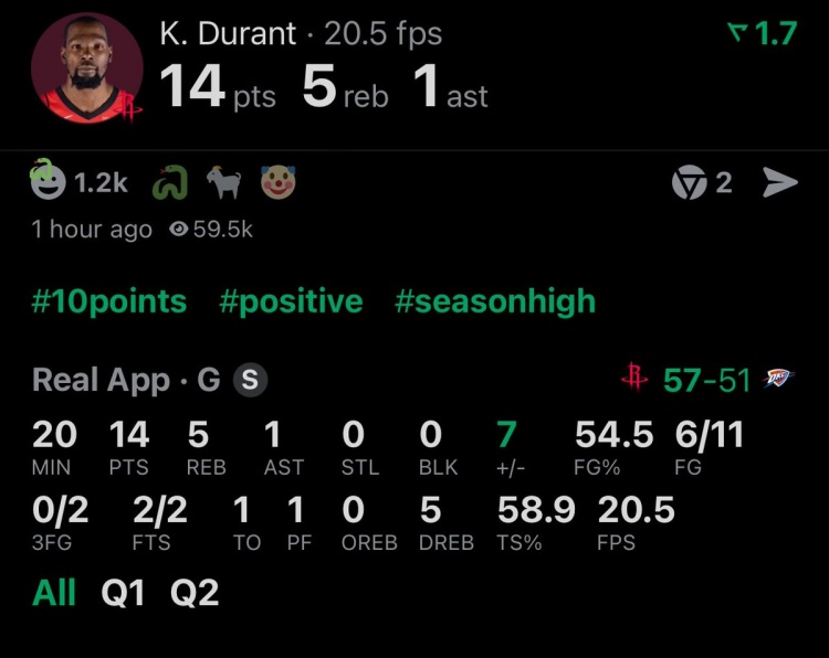 NBA常规赛,火箭半场57-51领跑 雷霆,杜兰特迎来火箭常规赛首秀,半场出色表现引发美网友热议。