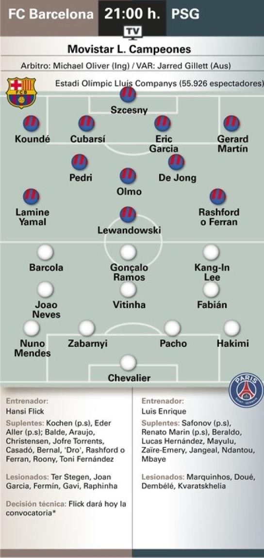 在莱万多夫斯基或费兰-托雷斯的悬念之外(也不排除两人同时上场),另一个焦点在后防,库巴西和埃里克-加西亚是热门人选,除非阿劳霍再次杆位。