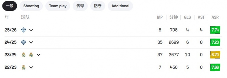 到了本赛季更是“一发不可收拾”,虽然只打了7场赛事 不过他每场必先发,且已经交出了4球4助功 的成绩,这么计算下去越过上赛季的“高度”几乎必然。个人场均评分7.74,也可知晓专业人士对他的认可。