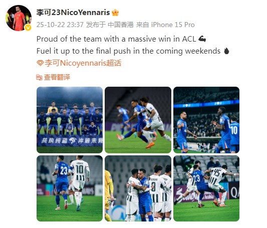 10月23日讯 亚冠精英第3轮赛事 ,申花主场作战 2-0击败首尔FC,取得新赛季亚冠首胜。赛后,英超直播在线高清(无插件)李可在社媒庆祝了这场获胜 。