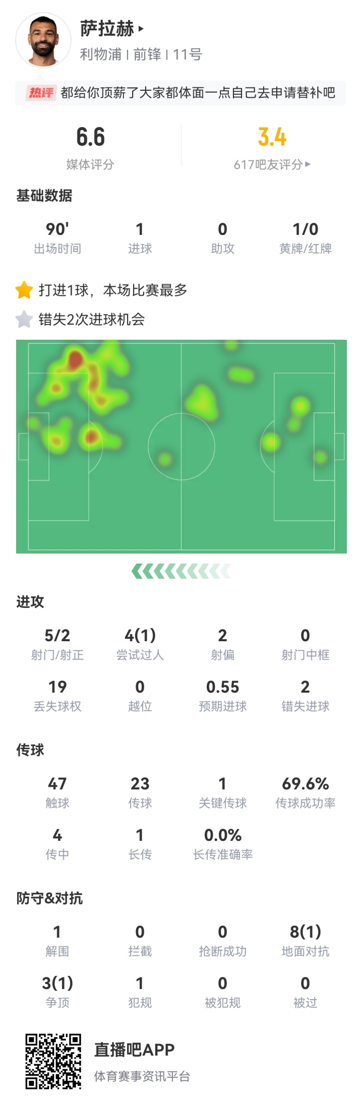 凌晨英超第9轮,利物浦2-3不敌布伦特福德。萨拉赫在赛事 最后时刻打入一球,英超免费高清直播但他今天的表现依然不能让球迷满意,给他打出了3.4分的低分。