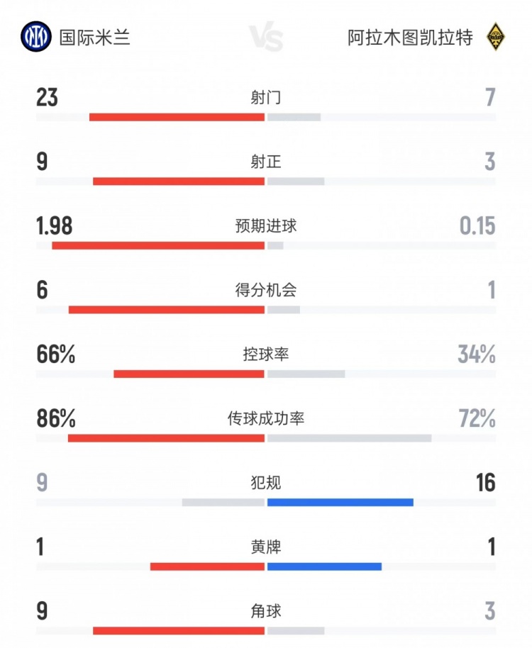 国米vs阿拉木图凯拉特全场数据: