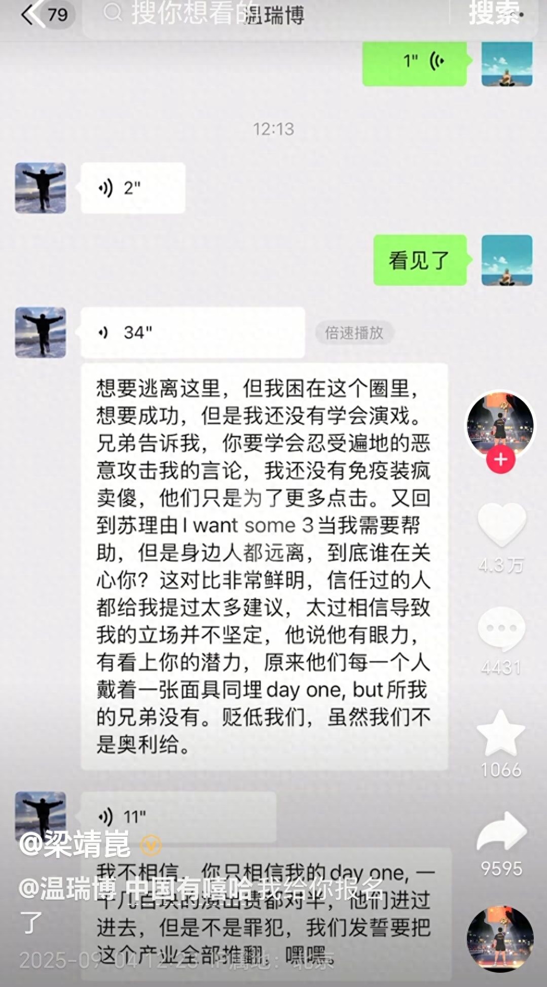 从视频中可以看到,温瑞博是将自己说唱的语音发给梁靖崑,但是梁靖昆在温瑞博给他发过来十分钟左右就录屏发到了自己的个人短视频平台上,并且还艾特了《中国新说唱》。