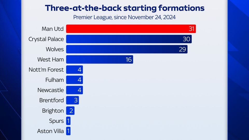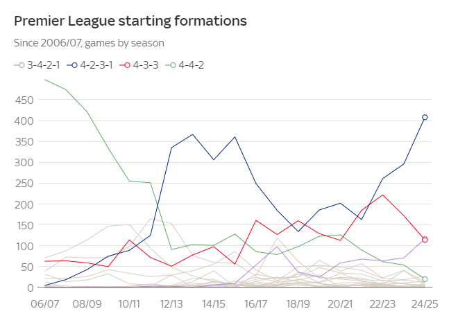 阿莫林喜欢的三后场球员在英超并不常见,近20年的数据展示出了英超球队阵形 的演变。