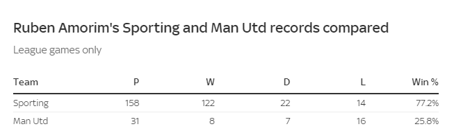 在执教葡萄牙体育期间,阿莫林在职业联赛 的胜率高达77.2%,而在曼联则仅为25.8%,在曼联历史主帅里垫底。