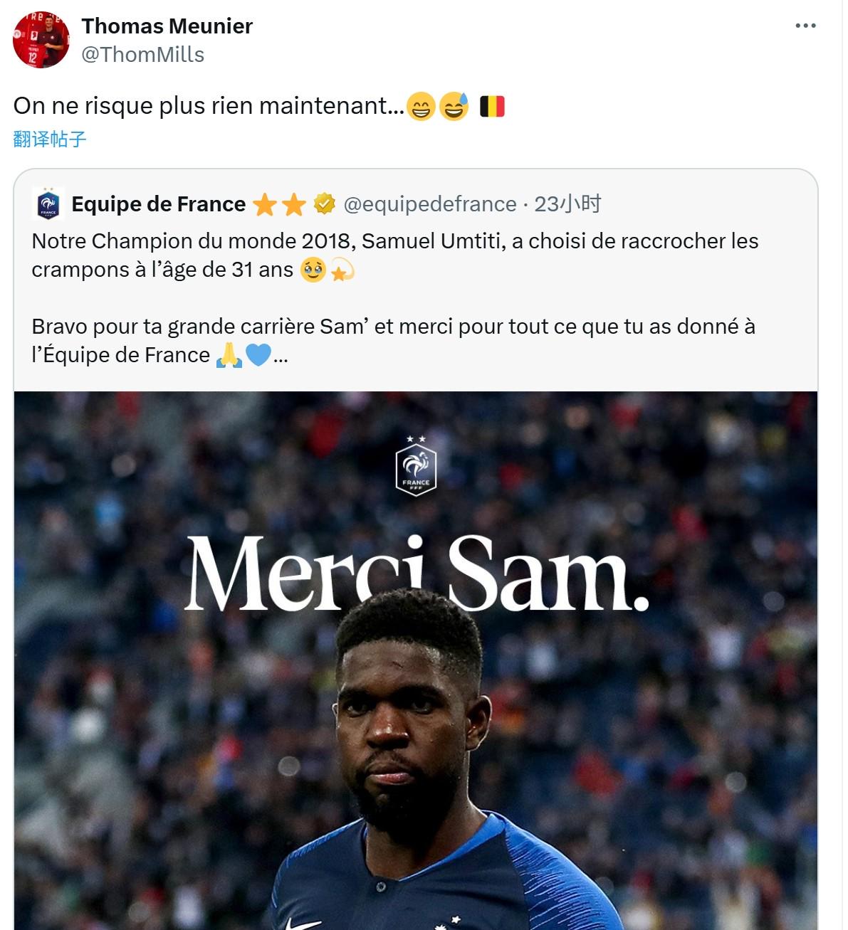 北京时间9月15日晚,31岁的前法国国脚、2018年世界杯赛 第一名 主力乌姆蒂蒂在社交媒体宣布退役。而曾与他交手的比利时国脚默尼耶也颇为诙谐地转发了法国队致敬乌姆蒂蒂的社媒并评论:“我们现在终于可以松口气意甲直播,不用再担心什么了。”