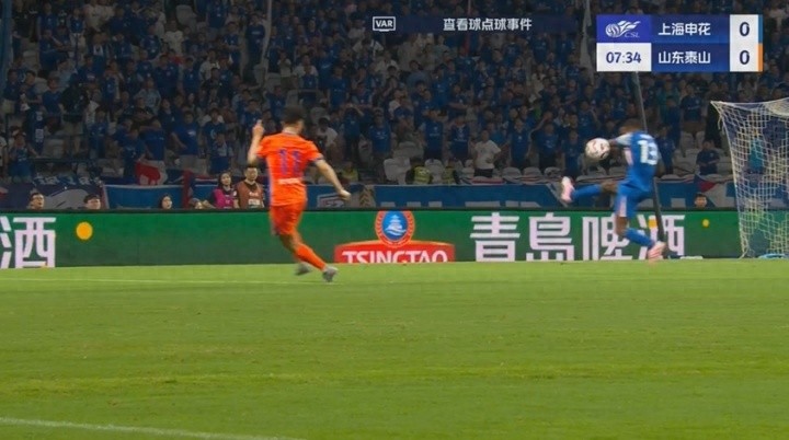 中超第24轮,上海申花主场作战 对阵山东泰山。赛事 第6分钟,泰山球员投诉马纳法防卫 时手球运动 ,VAR检查后确认没有违例 ,裁判 示意赛事 继续。
