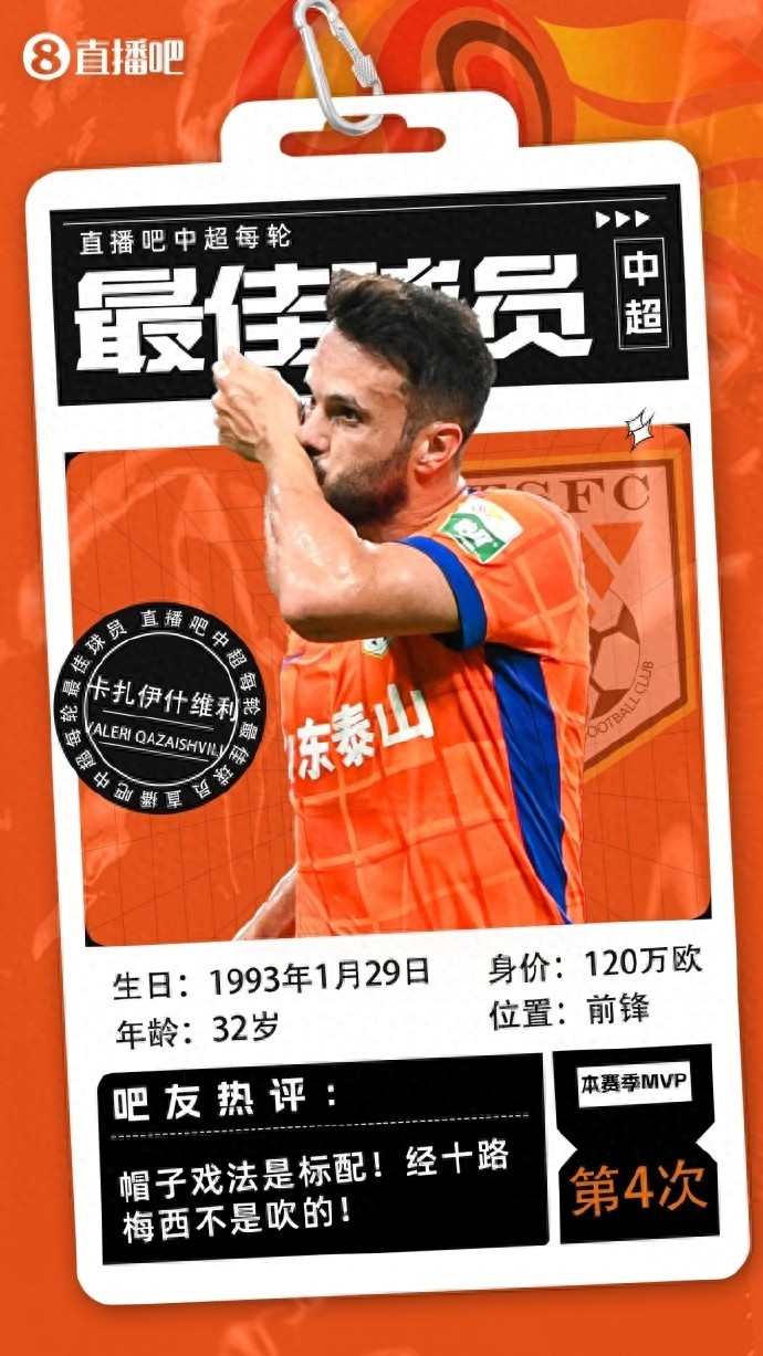 中超第24轮最佳球员评选结果出炉,卡扎伊什维利100%得票率连庄,这也是他本赛季第4次当选直播吧中超最佳,上一轮对阵北京国安交出4球1助的完美答卷,本轮客场应战 与上海申花,又是卡扎伊什维利上演独中三元,更有网友说,独中三元是他的标配,有的一辈子也能上演独中三元,可是他却不断上演独中三元,能不意外吗?
