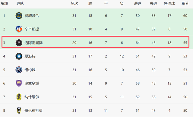 本场过后,迈阿密国际的排名继续提升,如今他们已经升上第3位。尽管迈阿密国际依然追赶 榜首的费城联合5分,不过他们比对手少踢2场,只要2场补赛能够全胜,迈阿密国际就将反超对手,成为东部第一。由于之前参加世俱杯和中北美联杯,迈阿密国际多场赛事 延期,导致他们被对手甩开差距,如今迈阿密国际强势归来,在梅西的带领下,接下来他们将全力抢分,争取拿到常规赛第一名 !