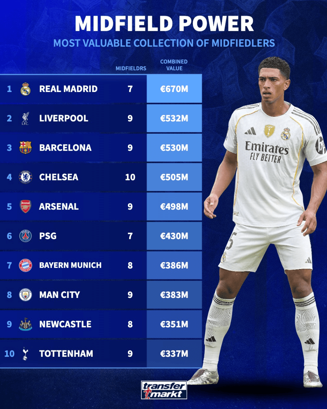 虎扑09月25日讯据德转数据统计 ,在俱乐部中场球员球员总身价榜中,皇马6.7亿欧居首,英超免费高清直播利物浦5.32亿欧排名第二,巴塞罗那5.3亿欧排名第三。