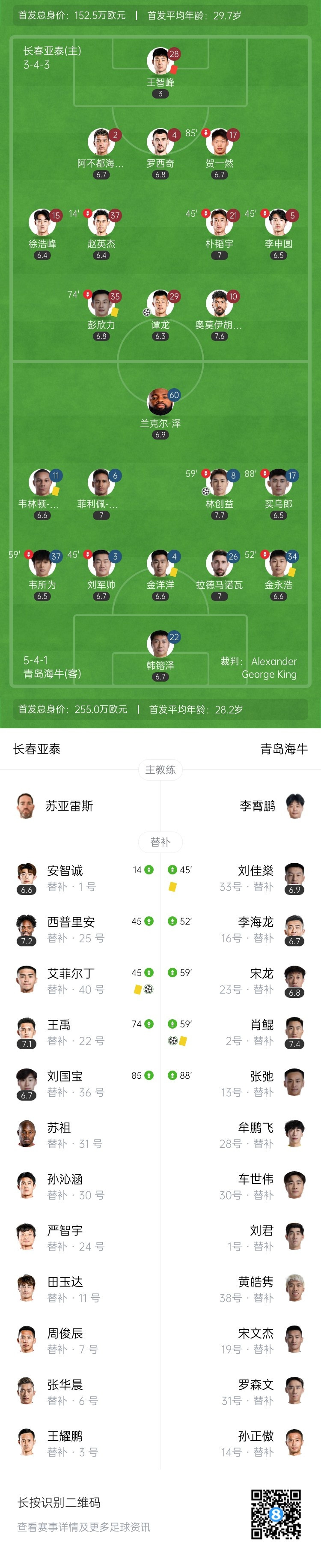 直播吧9月27日讯中超第26轮,长春亚泰坐镇主场作战 长春体育中心迎战青岛海牛。上半场,亚泰守门员王智峰第八分钟放倒单刀赴会的兰克尔-泽吃到直红意甲直播,林创益任意球得分,席尔瓦失单刀赴会。易边再战,肖鲲中超处子球再下一城,谭龙补时扳回一球,艾菲尔丁补时绝平。最终长春亚泰2-2青岛海牛。
