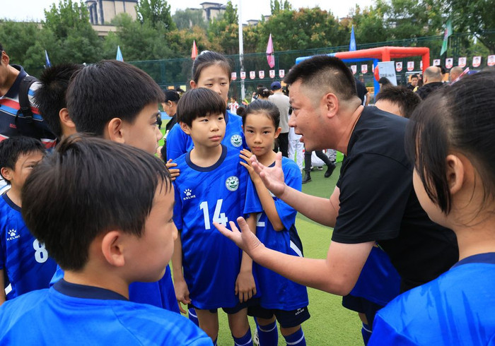 2025年9月27日,北京市“校园古代足球 主题月”活动在北京学校启动。中场球员休息,指导教练员员对小队员们进行指导。