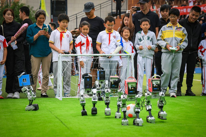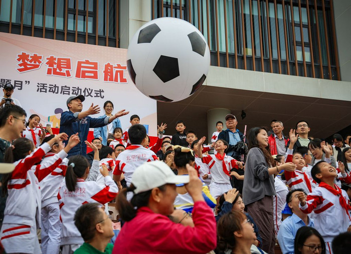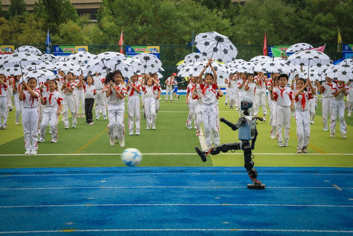 2025年9月27日,北京市“校园古代足球 主题月”活动在北京学校启动。开幕仪式 上,机器人进行开球表演。