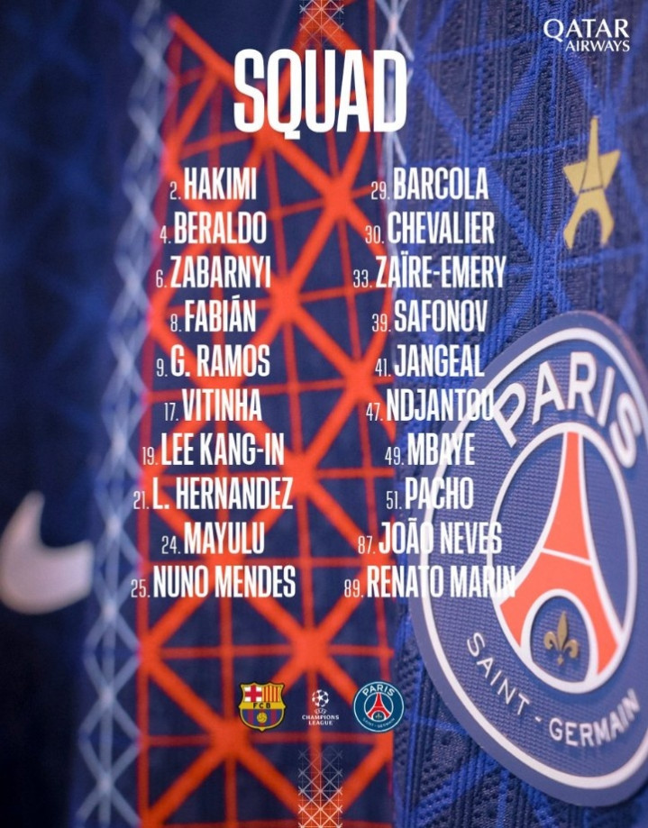 直播吧9月30日讯本轮欧冠迎来焦点战巴黎对阵巴萨,巴黎官方也公布了球队本场大名单,登贝莱、K77缺席,英超直播内维斯、法比安回归,具体如下: