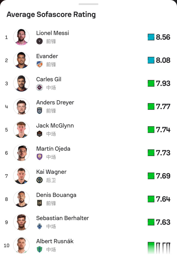 场均评分~SofaScore数据为例,梅西场均评分达到8.56,