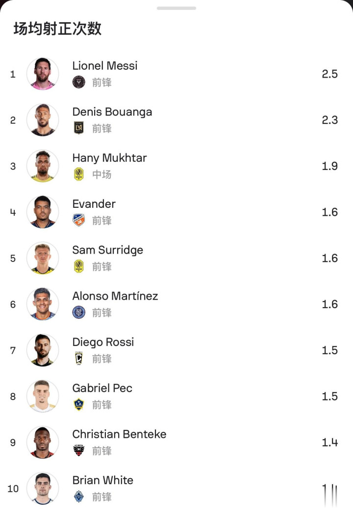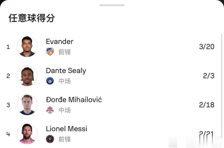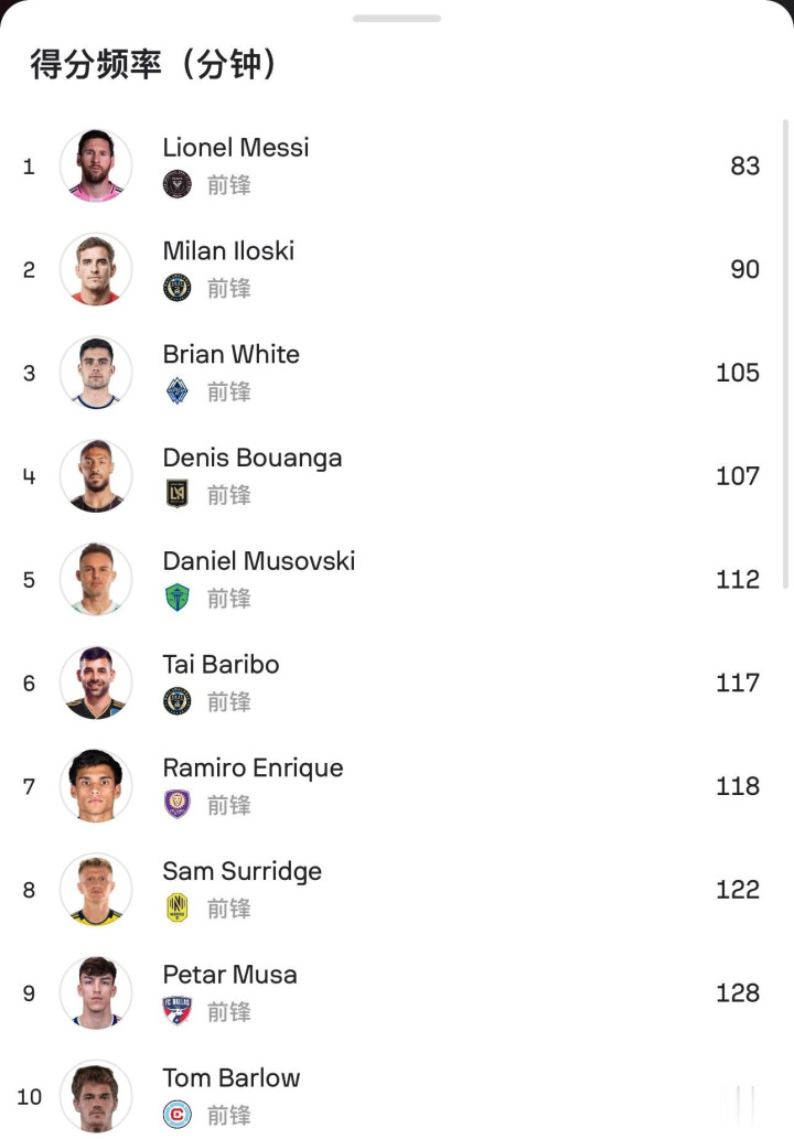 效率榜~梅西每83分钟就打入一球,是美职联所有球员中效率最高的