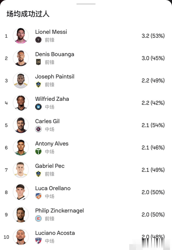 场均过人~梅西平均每场3.2次成功过人,53%的成功率排在第一