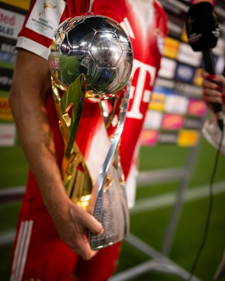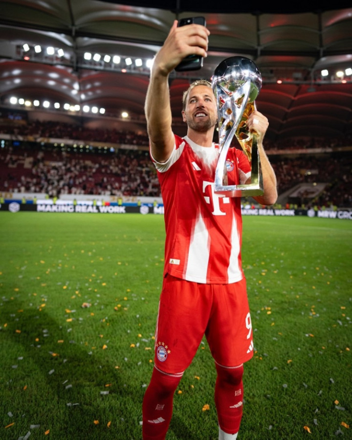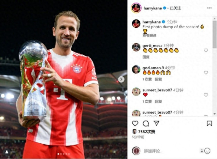 凯恩更新社媒动态,晒出手捧德超杯第一名 奖杯的照片,配文:“本赛季第一波照片大放送!”