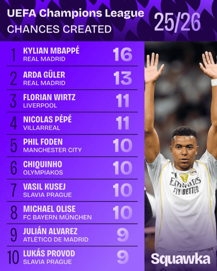 虎扑10月24日讯根据Squawka的统计,英超直播在线高清(无插件)姆巴佩是本赛季欧冠职业联赛 创造机会最多的球员: