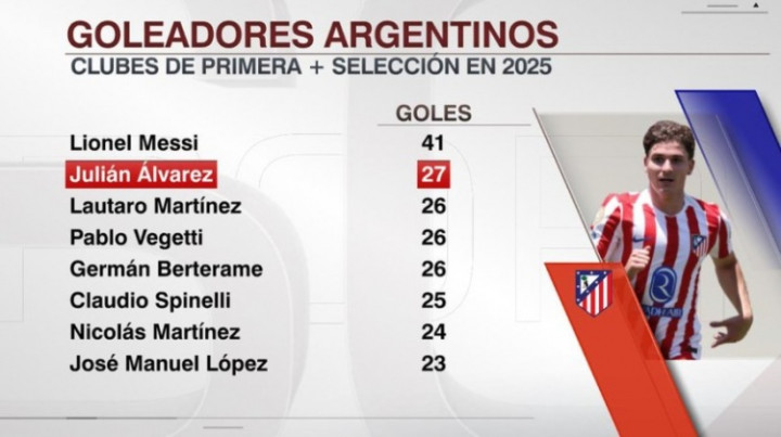进入2025年,英超免费高清直播阿尔瓦雷斯在俱乐部和国家队已打进27球,阿根廷球员中仅次于梅西的41球。在阿尔瓦雷斯身后是劳塔罗(26球)、维格蒂(26球)、贝尔泰拉梅(26球)、斯皮内利(25球)、尼古拉斯-马丁内斯(24球)以及何塞-洛佩斯(23球)。